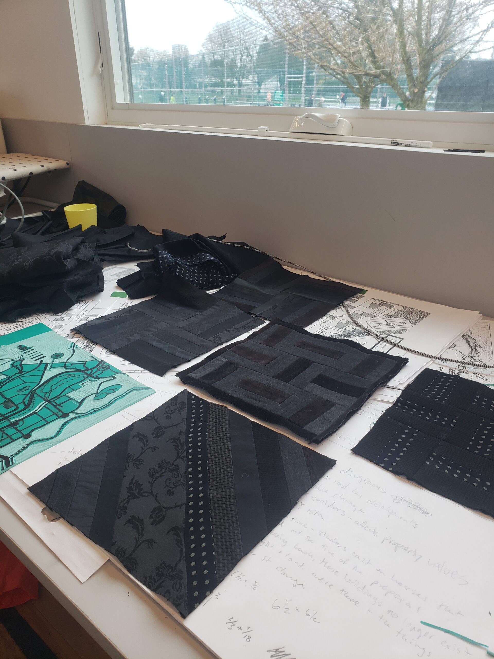 Parallel Lines is a pair of handmade “destination rollers” inspired by those used in the interurban trams which operated in the lower mainland from 1891-1958. Our research explores how the designation of the Edmonds area of Burnaby as a Transit Oriented District (TOD) has changed the demographic makeup and emotional character of the neighbourhood. Parallel Lines layers the people who live in Edmonds–represented by the craft techniques of quilting using reclaimed materials–over the graphics found in municipal zoning documents when Burnaby was planning the development of Edmonds Skytrain Station. This layering is an attempt to reassert the human impact of development in TODs.